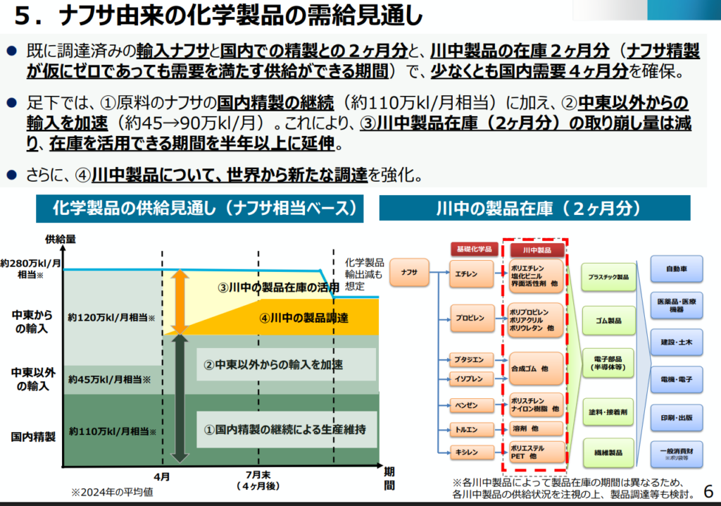 例えば、「6月頃には原材料のナフサが底をつき、設備が全く作れなくなる」といった噂がSNSなどで流れることがあります。しかし、経済産業省の最新の1次情報を確認すると、政府はエネルギーの安定供給に全力を挙げており、「ナフサの輸入が途絶えることはなく、必要な量はしっかりと確保する」という旨が明記されています。